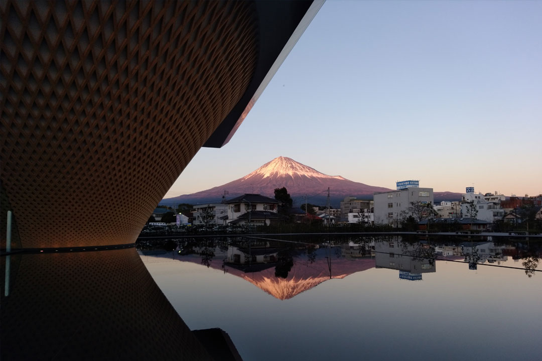 富士山への「畏敬」をカタチに。 静岡県富士山世界遺産センターは、展示棟、北棟、西棟の3棟で構成。中央の展示棟は木格子で覆われた逆円すい形のユニークなフォルムが特徴です。 その内側はらせんスロープになっていて、壁面に投影される富士山の風景を楽しみながら富士登山を疑似体験できます。木格子には、「富士ヒノキ」を使用しています。