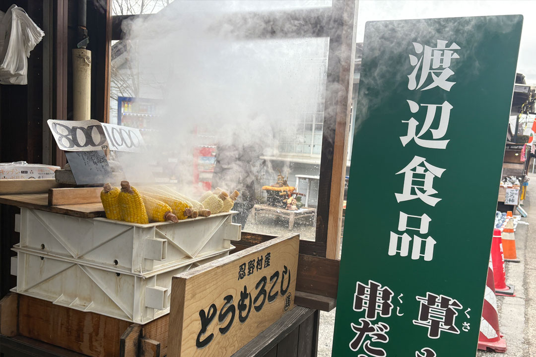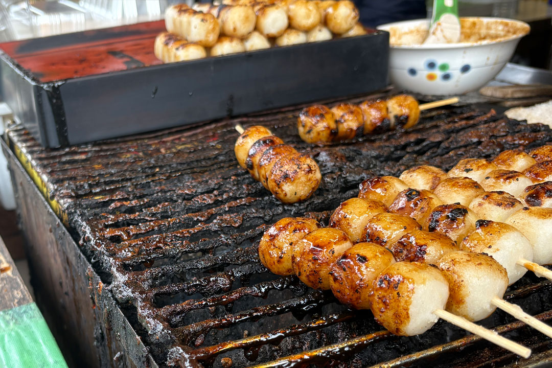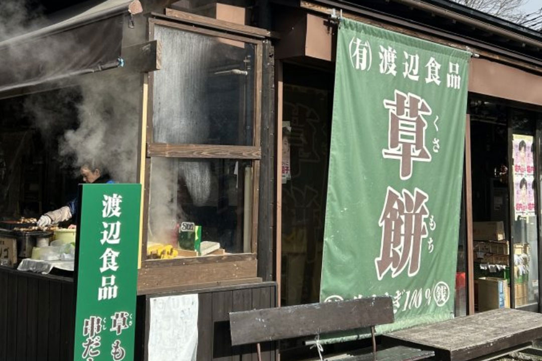 目の前でひとつひとつ焼き上げる草もちが香ばしくて絶品です。忍野村産よもぎ使用。