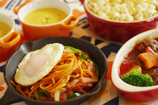 スキレット・ナポリタン/ 煮込みハンバーグ/ ポップコーン/ フルーツジュース/ コーンスープ