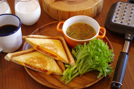 ベーコンとチーズのホットサンド(食パンスライス・ベーコン・スライスチーズ・マーガリン・トマト)/ 季節のスープ/ 牛乳/ コーヒー