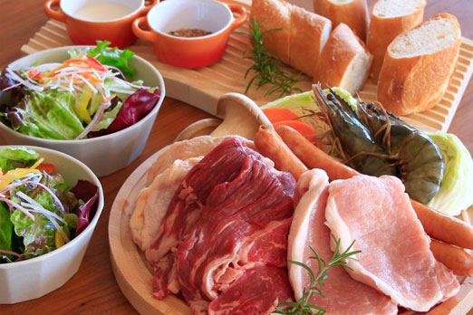 牛肩ロースステーキ(150g)、豚ロースステーキ(120g)、鶏モモ肉のグリル(100g)/ 有頭海老のグリル、炙りソーセージ 60g(1本)/ 季節の焼き野菜/ 季節の焼き野菜/ リーフサラダ/ 野菜スープ/ バケット/ PICAオリジナルBBQソース・オリジナルスパイス