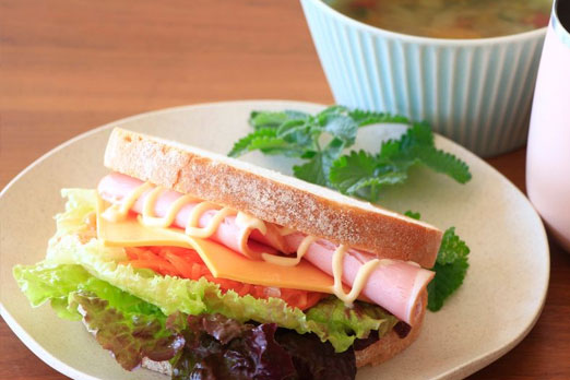 ロースハムとチーズのカンパーニュサンドイッチ/ 野菜のブイヨンスープ/ フルーツジュース、コーヒー