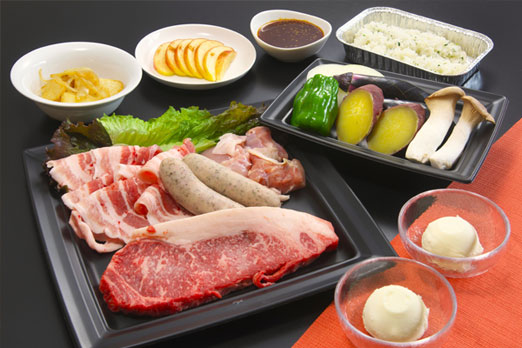 甲州ワインビーフサーロイン、富士桜ポーク、野菜などの食材、機材もご用意いたします。