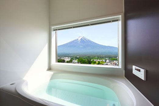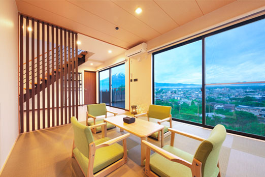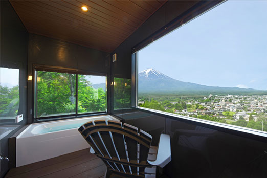 プライベートテラスとビューバスから富士を一望する