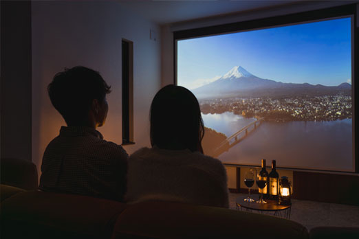 富士山を一望できるルーフトップヴィラの良さを残しながら、2Fリビングスペースに最新プロジェクター「popIn Aladdin」付シアタールーム。