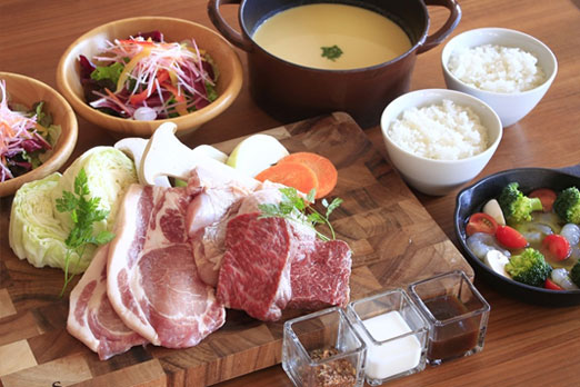 甲州牛ランプ150g/甲斐軍鶏モモ肉90G/富士桜ポークロース90g/季節の焼き野菜/小海老とマッシュルームのアヒージョ/ミネストローネスープ/焼きおにぎり