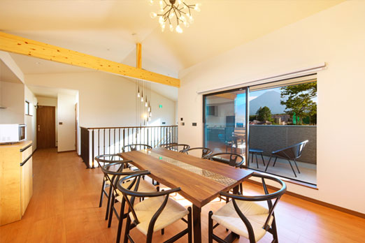 完全プライベート空間でゆったりと過ごせる「一棟貸しヴィラ」。富士山と夜空が一望できるテラス。富士吉田の街に溶け込むように設計されたヴィラは、長期滞在でも寛げるよう自宅のような使い勝手の良さを追求しました。
