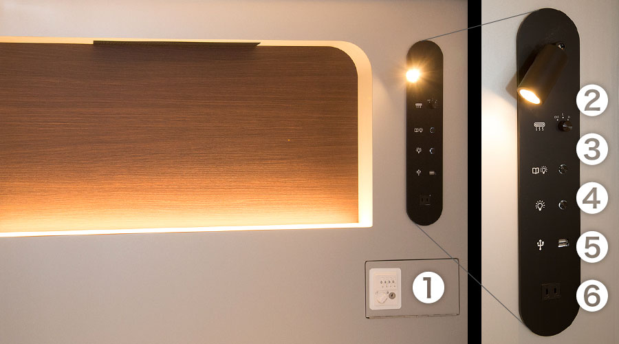 ① 収納ボックス/② 空調スイッチ/③ 読書灯スイッチ/④ 室内灯スイッチ/⑤ USB端子/⑥ コンセント/⑦ タオル(レンタル)/⑧ 寝具/⑨ 主電源/⑩ DO NOT DISTURB ボタン(起こさないでくださいの意思表示)